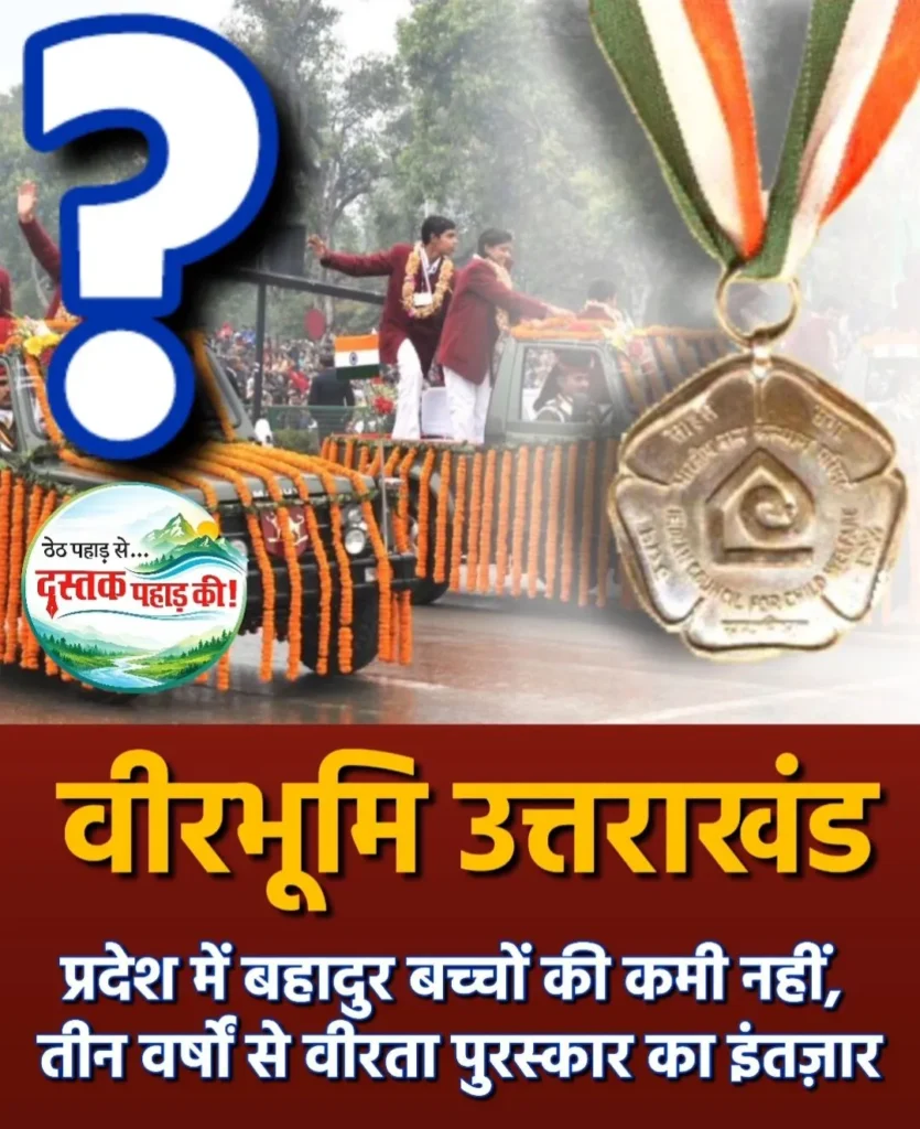 दस्तक पहाड़ न्यूज देहरादून। उत्तराखंड में बहादुर बच्चों की कोई कमी नहीं है। राज्य के कई बच्चों ने बीते वर्षों में जान जोखिम में डालकर दूसरों की जान बचाई है और राष्ट्रीय स्तर पर वीरता पुरस्कार भी हासिल किए हैं। बावजूद इसके, पिछले लगभग तीन वर्षों से राज्य स्तर पर बच्चों को वीरता पुरस्कार नहीं मिल पाया है।