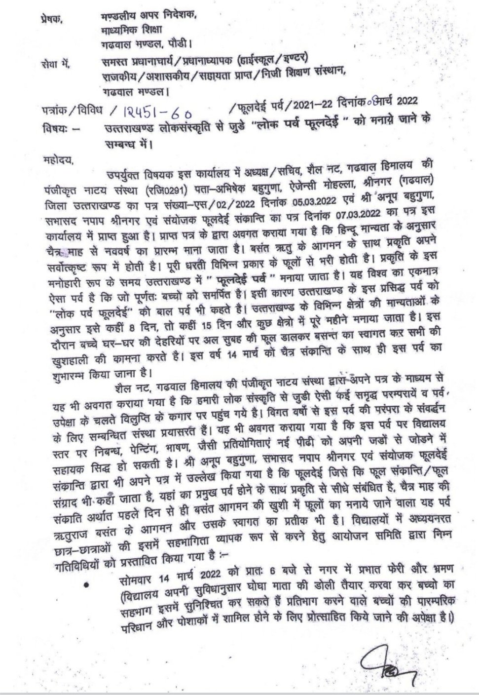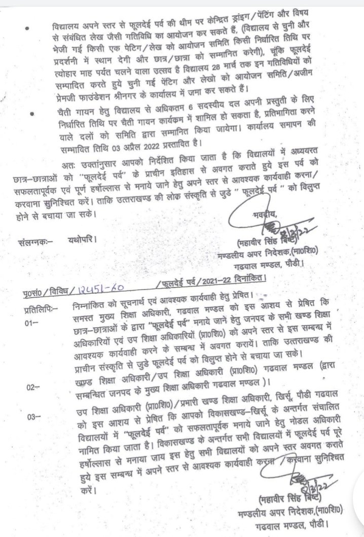 फूलदेई के आयोजन व विलुप्ति के कगार से बचाने के लिए योगदान देने की अपील की थी। इस पर अपर निदेशक माध्यमिक शिक्षा ने मंडल के सभी विद्यालयों में लोकपर्व