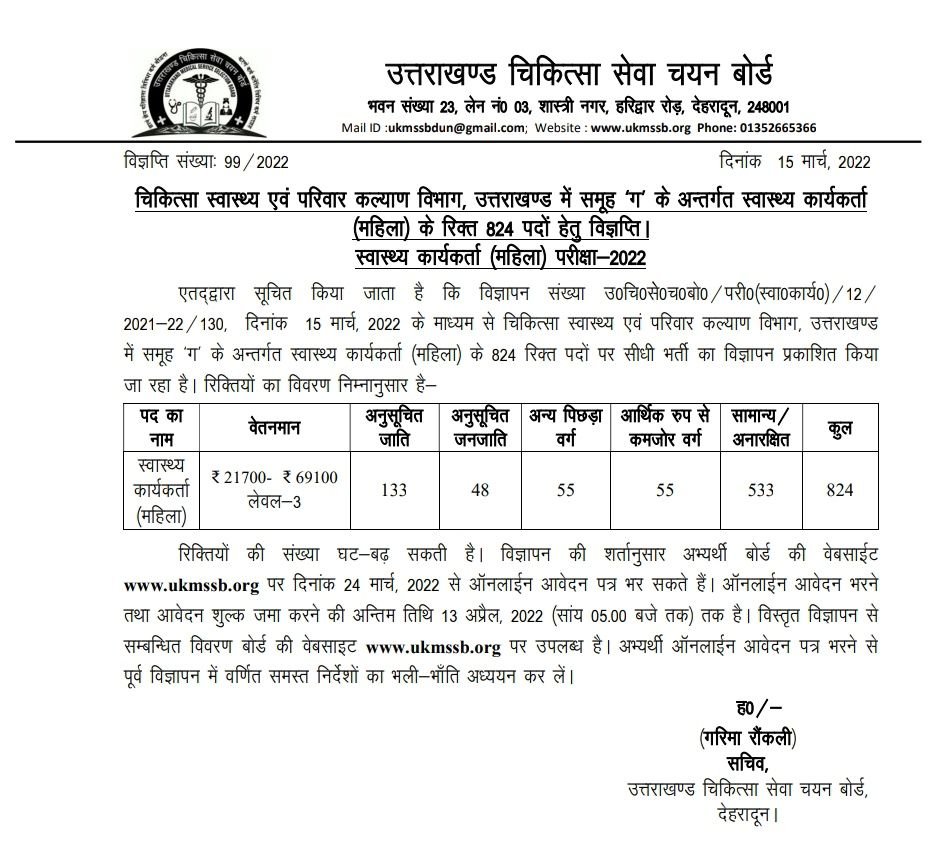 देहरादून: उत्तराखंड की महिलाओं के लिए बड़ी खबर है कि चिकित्सा स्वास्थ्य एवं परिवार कल्याण विभाग उत्तराखण्ड में समूह ‘ग’ के अन्तर्गत स्वास्थ्य कार्यकर्ता (महिला) के 824 रिक्त पदों पर सीधी भर्ती का विज्ञापन प्रकाशित किया गया है। रिक्तियों की संख्या घट-बढ़ सकती है। विज्ञापन की शर्तानुसार अभ्यर्थी बोर्ड की वेबसाईट www.ukmssb.org पर 24 मार्च 2022 से ऑनलाईन आवेदन पत्र भर सकते हैं। ऑनलाईन आवेदन भरने तथा आवेदन शुल्क जमा करने की अन्तिम तिथि 13 अप्रैल 2022 (सांय 05.00 बजे तक) तक है। विस्तृत विज्ञापन से सम्बन्धित विवरण बोर्ड की वेबसाइट www.ukmssb.org पर