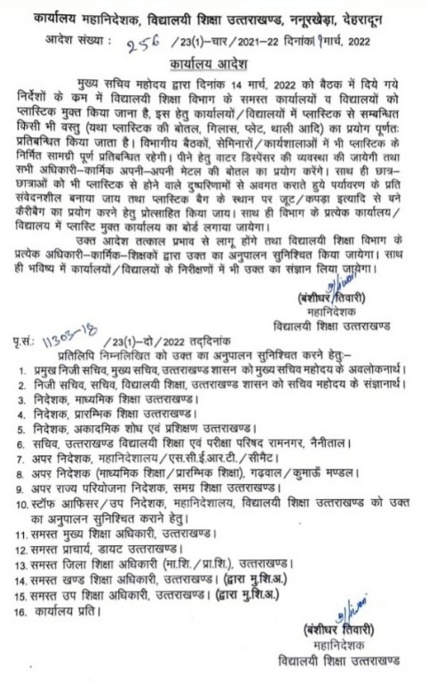 देहरादून। महानिदेशक विद्यालयी शिक्षा उत्तराखंड की ओर से उत्तराखंड शिक्षा विभाग के समस्त कार्यालयों और विद्यालयों के लिए एक आदेश जारी किया है।आदेश में कहा गया है कि मुख्य सचिव उत्तराखंड द्वारा दिनांक 14 मार्च, 2022 को बैठक में दिये गये निर्देशों के कम में विद्यालयी शिक्षा विभाग के समस्त कार्यालयों व विद्यालयों को प्लास्टिक मुक्त किया जाना है, इस हेतु कार्यालयों / विद्यालयों में प्लास्टिक से सम्बन्धित किसी भी वस्तु (यथा प्लास्टिक की बोतल, गिलास, प्लेट, थाली आदि) का प्रयोग तत्काल पूर्णतः प्रतिबन्धित किया जाता है।आदेश में कहा गया है कि विभागीय बैठकों, सेमिनारों / कार्यशालाओं में भी प्लास्टिक के निर्मित सामग्री पूर्ण प्रतिबन्धित रहेगी।