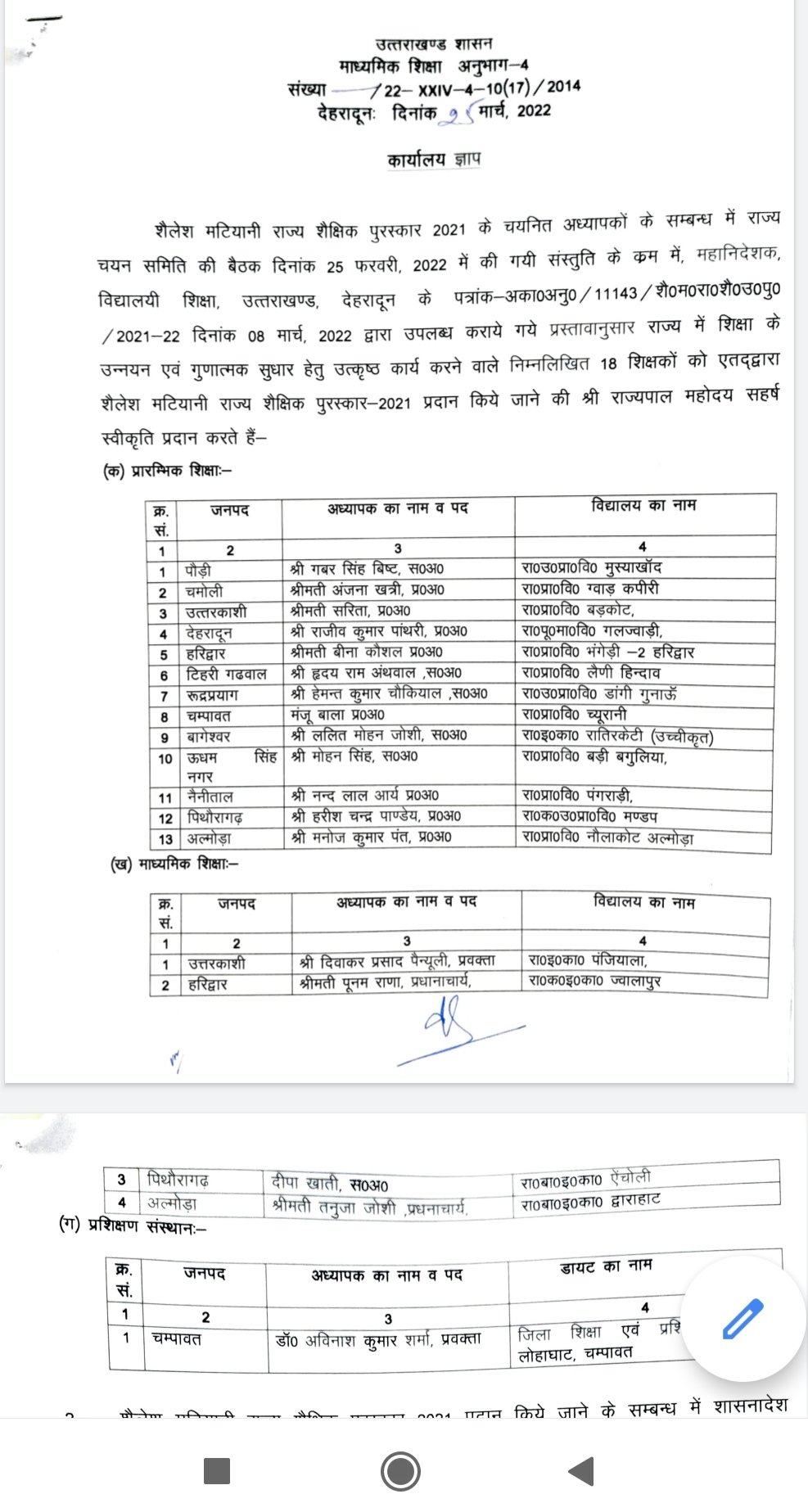 उत्तराखंड में शिक्षा के उन्नयन एवं गुणात्मक सुधार हेतु उत्कृष्ठ कार्य करने वाले 18 शिक्षकों को शैलेश मटियानी राज्य शैक्षिक पुरस्कार 2021 प्रदान किया