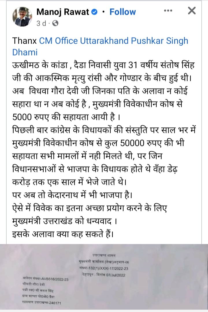 पूर्व विधायक मनोज रावत लिखते है “Thanx CM Office Uttarakhand Pushkar Singh Dhami ऊखीमठ के कांडा , दैडा निवासी युवा 31 वर्षीय संतोष सिंह जी की आकस्मिक मृत्यु रांसी और गोण्डार के बीच हुई थी। अब विधवा गौरा देवी जी जिनका पति के अलावा न कोई सहारा था न अब कोई है , मुख्यमंत्री विवेकाधीन कोष से 5000 रुपए की सहायता आयी है ।