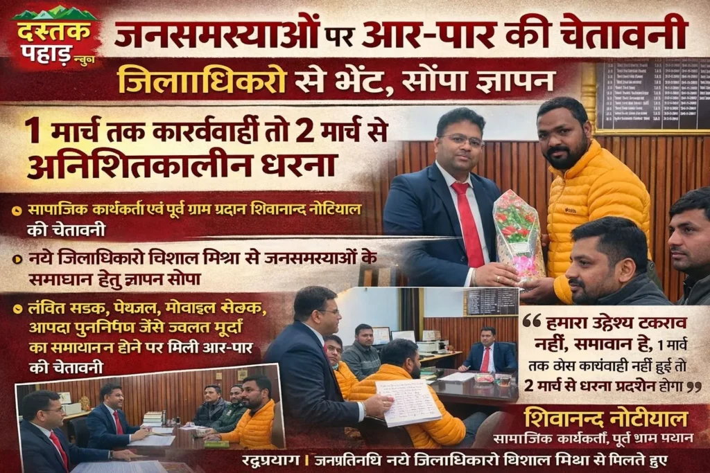 सामाजिक कार्यकर्ता एवं पूर्व ग्राम प्रधान शिवानन्द नौटियाल ने कहा कि आज क्षेत्र की विभिन्न जनसमस्याओं को लेकर जिलाधिकारी महोदय से भेंट कर ज्ञापन सौंपा गया है। जनहित से जुड़े इन महत्वपूर्ण मुद्दों का शीघ्र समाधान आवश्यक है, ताकि क्षेत्र की जनता को राहत मिल सके। उन्होंने स्पष्ट चेतावनी दी कि यदि 1 मार्च तक समस्याओं के समाधान हेतु ठोस कार्यवाही प्रारम्भ नहीं की जाती है, तो क्षेत्रवासी 2 मार्च से अनिश्चितकालीन धरना-प्रदर्शन करने के लिए बाध्य होंगे, जिसकी सम्पूर्ण जिम्मेदारी प्रशासन की होगी। उन्होंने कहा, हमारा उद्देश्य टकराव नहीं, समाधान है। जनहित में शीघ्र सकारात्मक कार्यवाही की अपेक्षा है। प्रतिनिधिमंडल ने यह भी बताया कि 28/29 अगस्त 2025 को आई भीषण आपदा के बाद अब तक कई पुनर्निर्माण कार्य अधूरे हैं, जिससे जनजीवन प्रभावित है।