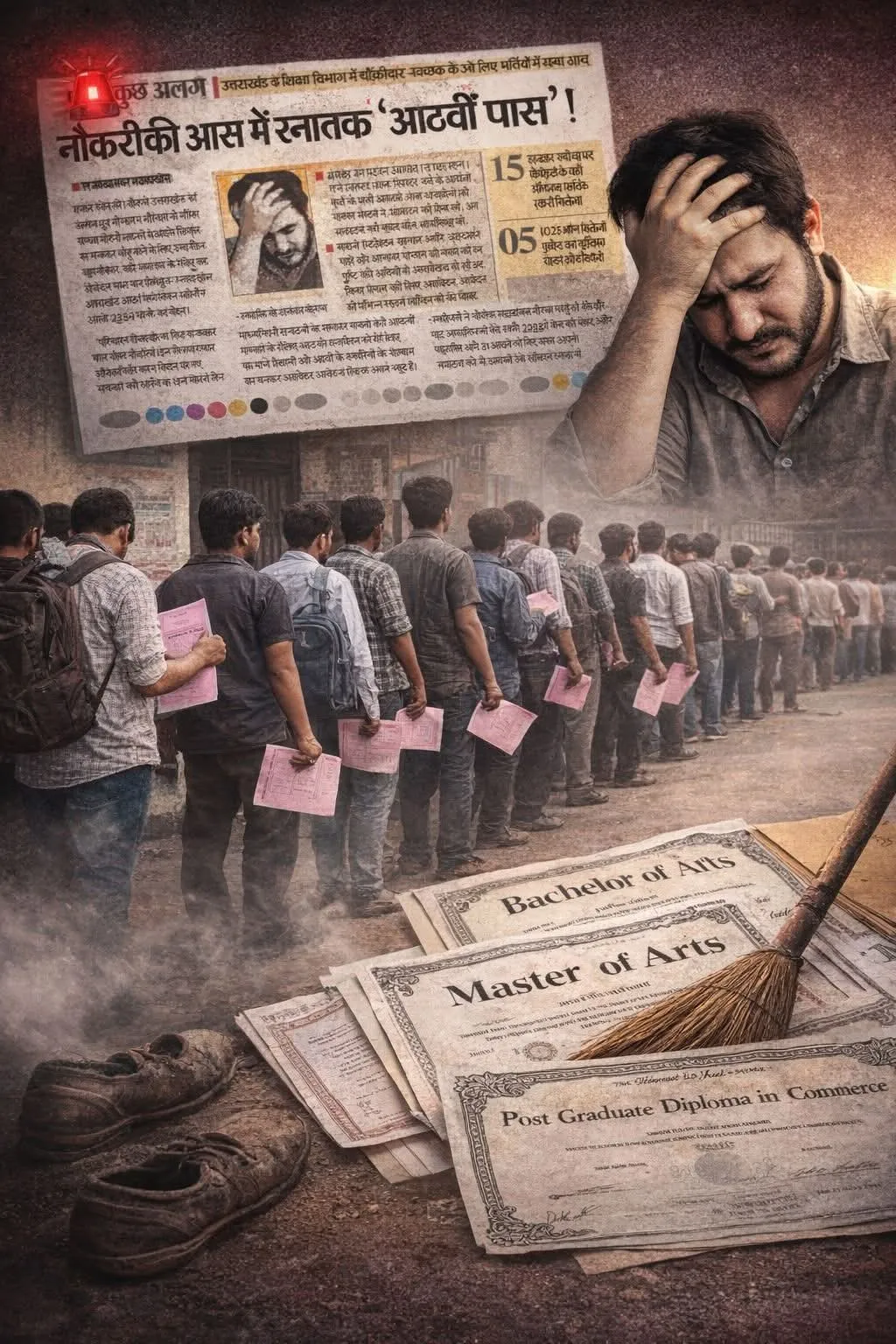 दस्तक पहाड न्यूज अगस्त्यमुनि।। उत्तराखंड में निकली एक ताज़ा भर्ती ने राज्य की रोजगार व्यवस्था पर गंभीर सवाल खड़े कर दिए हैं। उत्तराखंड शिक्षा विभाग द्वारा चौकीदार, स्वच्छक और सहायक जैसे पदों के लिए कुल 2364 पदों पर भर्ती प्रक्रिया शुरू की गई है। इन पदों के लिए न्यूनतम शैक्षणिक योग्यता कक्षा 5वीं और 8वीं पास निर्धारित की गई है। हैरान करने वाली बात यह है कि इस भर्ती में बड़ी संख्या में स्नातक और परास्नातक (पोस्ट ग्रेजुएट) युवा भी आवेदन करने को मजबूर हैं। कई युवा अपनी उच्च शिक्षा छिपाकर खुद को “आठवीं पास” दर्शाने के लिए प्रमाण जुटाने में लगे हैं, ताकि आवेदन निरस्त न हो जाए।