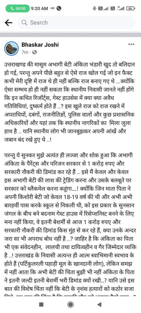 अंकिता के पिता को लालची ठहरा देना भी वही मानसिकता है जो विनोद आर्य और उसके बेटे पुलकित आर्य और उसके उन साथियों की है जिन्होंने अंकिता की हत्या की ।