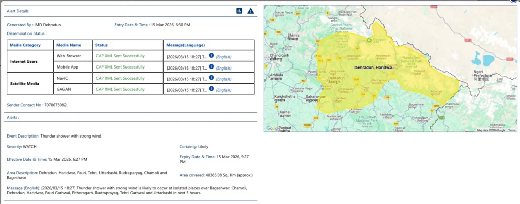 दस्तक पहाड न्यूज रुद्रप्रयाग।। उत्तराखंड में मौसम ने एक बार फिर करवट ले ली है। मौसम विभाग ने रविवार 15 मार्च 2026 को शाम 6:27 बजे से रात 9:27 बजे तक राज्य के कई जिलों के लिए येलो अलर्ट जारी किया है।