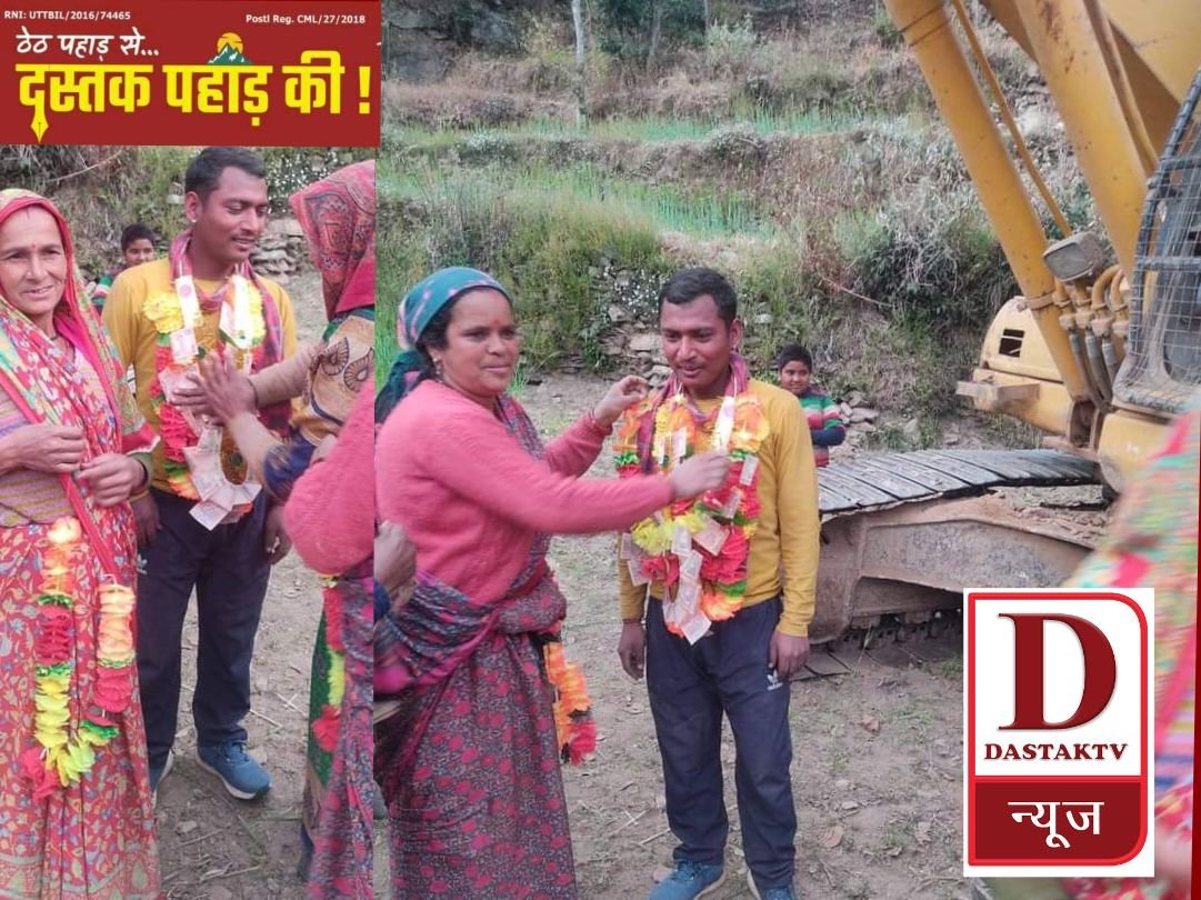 दीपक बेंजवाल।  अगस्त्यमुनि दस्तक पहाड न्यूज- अगस्त्यमुनि विकास खण्ड के दूरस्थ गाँव खाल्यूँ में लंबे इंतजार के बाद आखिरकार सड़क पहुँच गई है। रविवार को जैसे ही सड़क निर्माण में लगा जेसीबी गाँव के नजदीक पहुँचा, वहाँ पहले से स्वागत के लिए खड़े ग्रामीणों ने जेसीबी चालक को नोटो की माला पहनाकर जोरदार स्वागत किया। ग्रामीणों ने ढोल-दमाऊ की थाप पर जमकर उत्सव मनाया। गाँव तक सड़क आने की खुशी में महिला मंगल दल अध्यक्ष अरुणा देवी, पार्वती देवी, विनीता देवी, सरिता देवी, सुमन देवी, कांता देवी, उषा