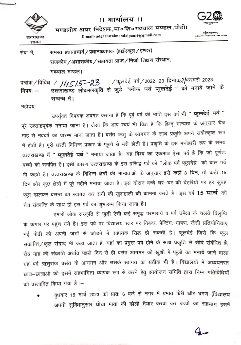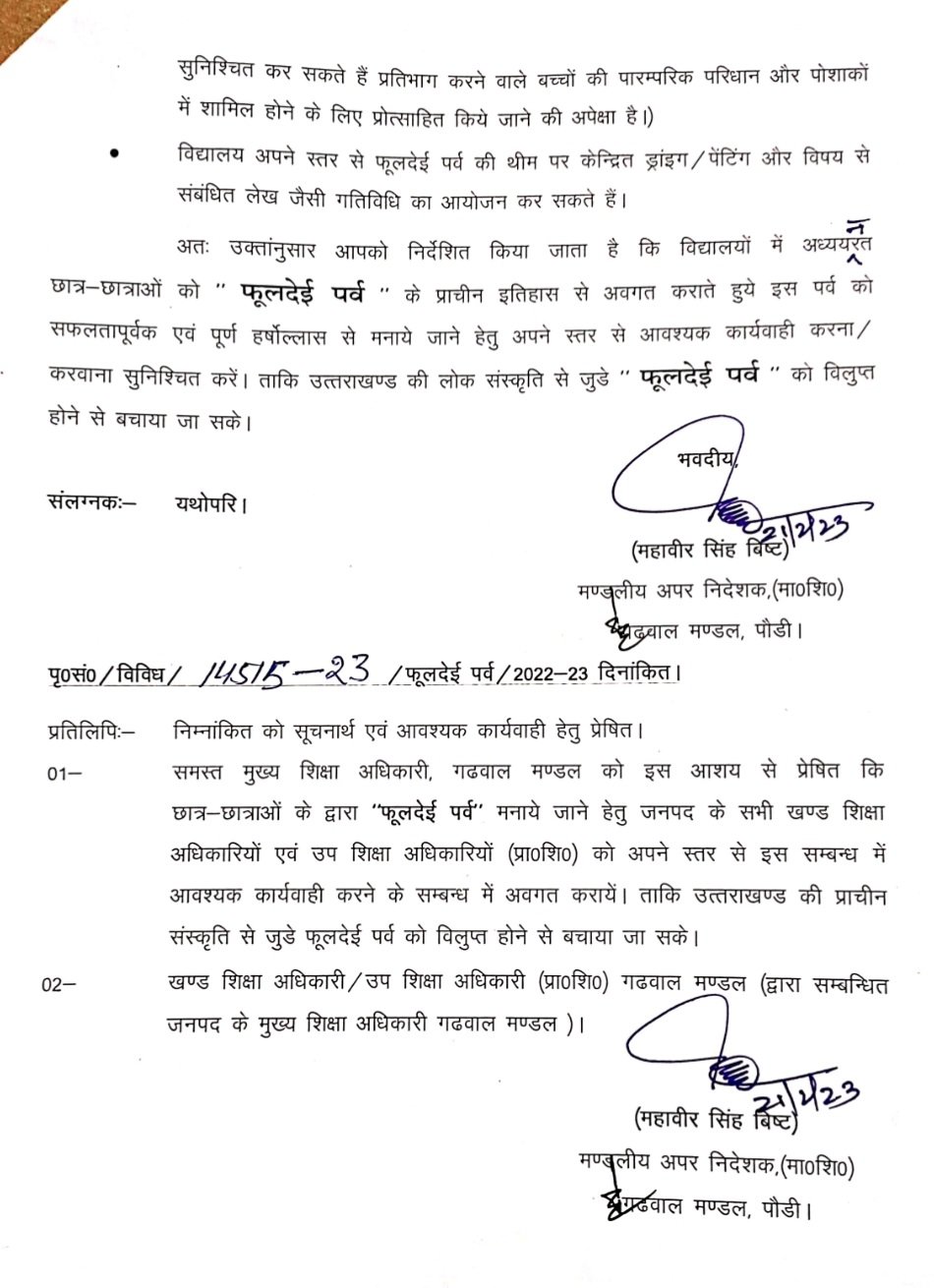गढ़वाल मण्डल के समस्त राजकीय, अशासकीय,सहायता प्राप्त, निजी शिक्षण संस्थाओं के प्रधानाचार्य, प्रधानाध्यापकों पत्र लिखकर फूलदेई पर्व मनाने के आदेश