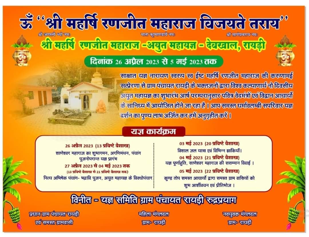 बता दे प्राचीन परंपरानुसार भगवान साणेश्वर महाराज रायड़ी गाँव के महर्षि रणजीत महाराज महायज्ञ में सम्मिलित होने लिए जाते है। तदुपरांत ही वहां मन्दिर में कुंड गज के बाद नव दिवसीय आयुत महायज्ञ का प्रारंभ होता है।