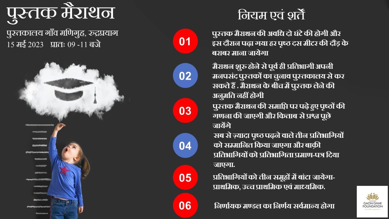 15 मई 2023 को पुस्तकालय गाँव मणिगुह में पुस्तक प्रेमियों का जमघट लगेगा। ‘पुस्तक मैराथन’ में आप को अपनी पसंदीदा किताब के साथ कुछ घंटे बिताने हैं। इस दौरान आप जितने पृष्ठों की यात्रा करेंगे वह देखी परखी जाएगी। अपनी तरह के इस अनोखे आयोजन में पुस्तक प्रेमियों को आमंत्रित किया गया है।