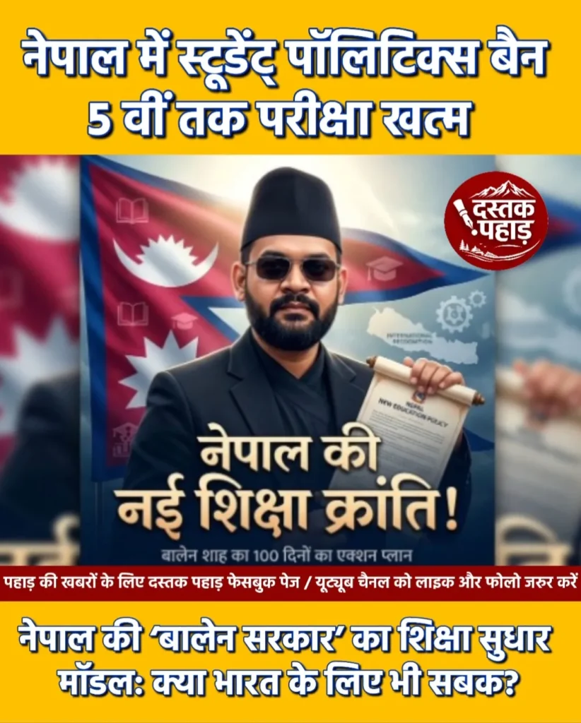 दस्तक पहाड़ न्यूज अगस्त्यमुनि।। भारत के पड़ोसी देश नेपाल में हाल ही में प्रधानमंत्री बालेन शाह के नेतृत्व में प्रस्तुत की गई 100-दिवसीय शिक्षा कार्य योजना ने पूरे दक्षिण एशिया में बहस छेड़ दी है। इस योजना का सबसे चर्चित पहलू है—शिक्षण संस्थानों से छात्र राजनीति को पूरी तरह बाहर करने का निर्णय। सरकार का दावा है कि इससे शिक्षा को राजनीतिक प्रभाव से मुक्त कर उसे ज्ञान-केंद्रित और अंतरराष्ट्रीय स्तर का बनाया जा सकेगा।