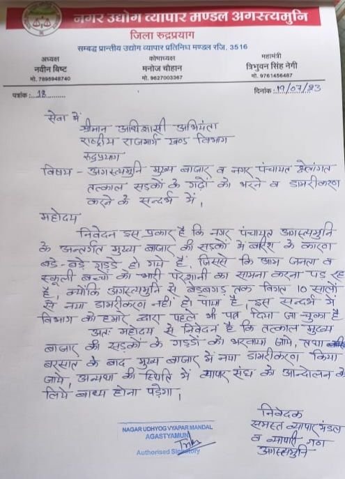 उनका कहना है कि नगर पंचायत अगस्त्यमुनि के अन्तर्गत मुख्य बाजार की सड़कों में बारिश के कारण बड़े-बड़े गड्डे हो गये हैं, जिससे कि आम जनता व स्कूली बच्चों को भारी परेशानी का सामना करना पड़ रहा है। क्योंकि अगस्त्यमुनि से बेड्बगड़ तक विगत 10 सालों से नया डामरीकरण नहीं हो पाया है। इस सन्दर्भ में विभाग को हमारे द्वारा पहले भी पत्र दिया जा चुका है। अगर विभाग तत्काल मुख्य बाजार की सड़कों के गड्डों को भरवाया नहीं गया तो अन्यथा की स्थिति में व्यापार संघ को आन्दोलन के लिये बाध्य होना पड़ेगा।