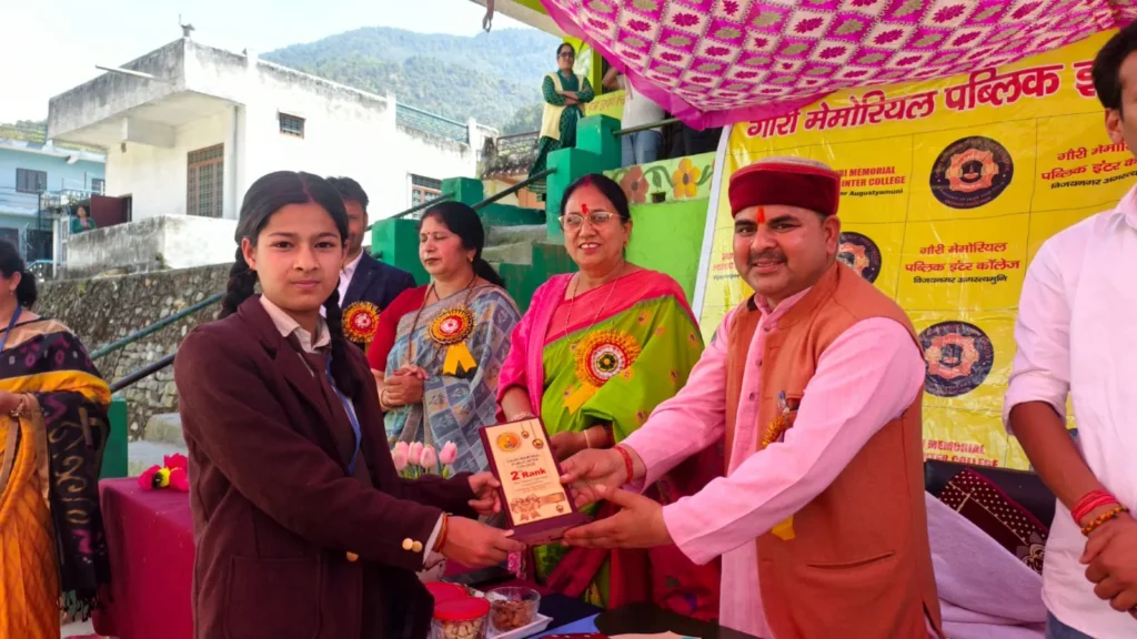 दस्तक पहाड़ न्यूज अगस्त्यमुनि।। गौरी मेमोरियल पब्लिक इंटर कॉलेज, विजय नगर अगस्त्यमुनि में वार्षिक परीक्षा परिणाम वितरण समारोह का भव्य आयोजन किया गया। कार्यक्रम में केदारनाथ विधायक श्रीमती आशा नौटियाल मुख्य अतिथि के रूप में उपस्थित रहीं।इस अवसर पर मेधावी छात्र-छात्राओं कोमेधावी छात्र-छात्राओं को पुरस्कार एवं प्रमाण पत्र देकर सम्मानित किया गया। कार्यक्रम में विद्यालय का परीक्षा परिणाम शत-प्रतिशत रहने पर हर्ष व्यक्त किया गया।मुख्य अतिथि विधायक आशा नौटियाल ने अपने संबोधन में विद्यार्थियों को कड़ी मेहनत, अनुशासन और लक्ष्य के प्रति समर्पण का संदेश देते हुए कहा कि सफलता का कोई शॉर्टकट नहीं होता। निरंतर प्रयास और सकारात्मक सोच से ही जीवन में ऊंचाइयों को प्राप्त किया जा सकता है। उन्होंने कहा कि अगस्त्यमुनि नगर शिक्षा का एक प्रमुख केंद्र बन चुका है और गौरी मेमोरियल इंटर कॉलेज ने अपनी एक खास पहचान बनाई है। यहां से पढ़कर निकले अनेक छात्र आज विभिन्न उच्च पदों पर कार्यरत हैं, जो इस संस्थान की गुणवत्ता को दर्शाता है। उन्होंने सभी सफल विद्यार्थियों को शुभकामनाएं देते हुए उनके उज्ज्वल भविष्य की कामना की।विद्यालय के प्रधानाचार्य विजय चमोला ने मुख्य अतिथि का स्वागत करते हुए कहा कि विद्यालय का शत-प्रतिशत परीक्षा परिणाम विद्यार्थियों, शिक्षकों और अभिभावकों के सामूहिक प्रयास का परिणाम है। उन्होंने कहा कि उत्तराखंड राज्य बोर्ड परीक्षा में गौरी मेमोरियल इंटर कॉलेज के विद्यार्थी प्रतिवर्ष मेरिट सूची में स्थान प्राप्त करते हैं। विद्यालय गुणवत्तापूर्ण शिक्षा के लिए प्रतिबद्ध है और भविष्य में भी छात्रों को बेहतर शैक्षणिक वातावरण प्रदान करता रहेगा।कार्यक्रम में विद्यालय प्रबंधन समिति के अध्यक्ष मनोज राणा, जिला मंत्री मुकुल मैठाणी, ओबीसी जिला अध्यक्ष सतीश प्रसाद, महिला मोर्चा अध्यक्ष सुमन जमलोकी, रमेश नौटियाल सहित कई गणमान्य लोग उपस्थित रहे। इस दौरान अभिभावकों, शिक्षकों एवं स्थानीय नागरिकों की गरिमामयी उपस्थिति रही। अंत में धन्यवाद ज्ञापन के साथ कार्यक्रम का सफल समापन हुआ।