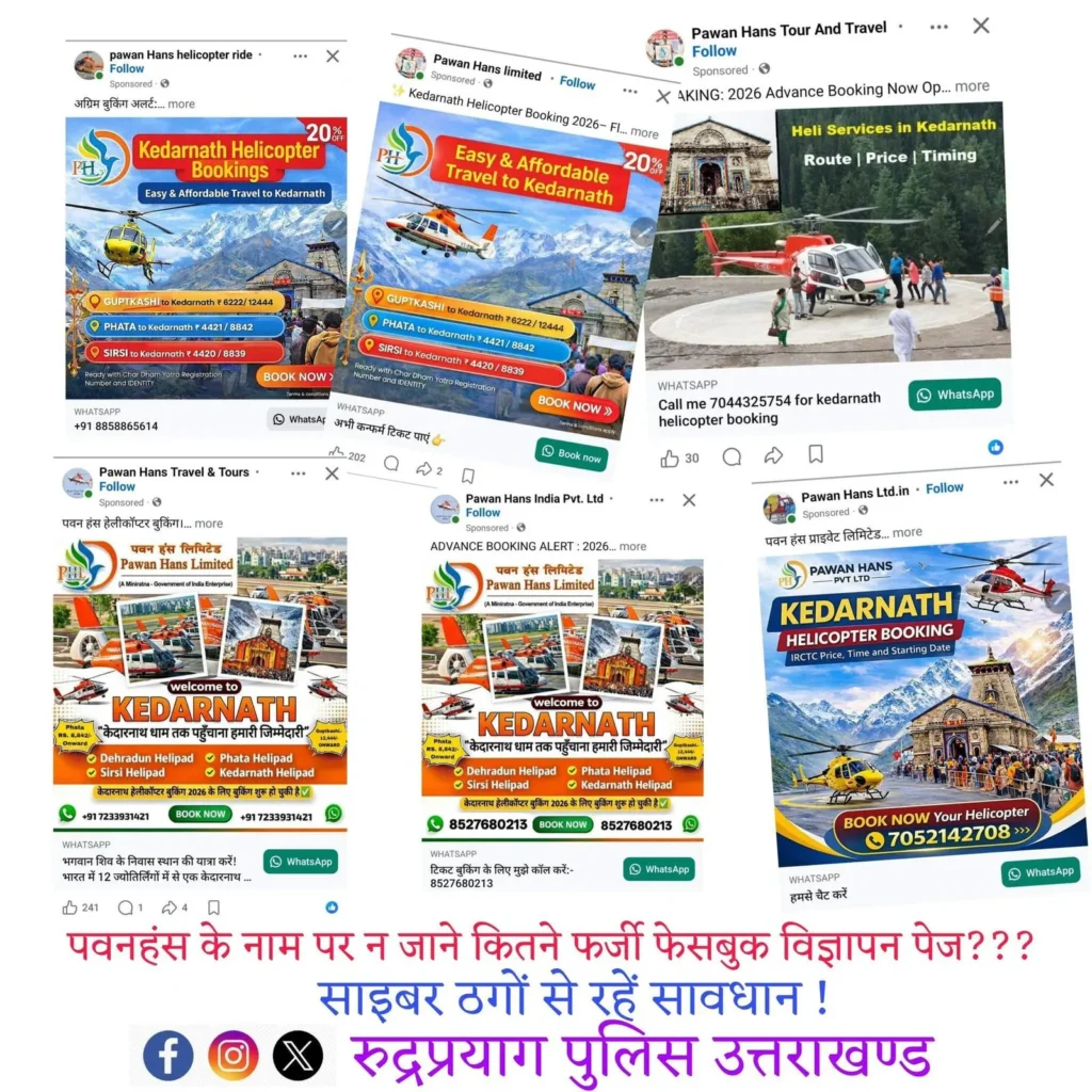 दस्तक पहाड़ न्यूज रुद्रप्रयाग। । आगामी श्री केदारनाथ धाम यात्रा 2026 के दृष्टिगत श्रद्धालुओं को साइबर ठगी से सतर्क रहने हेतु महत्वपूर्ण एडवाइजरी जारी की गई है। चारधाम यात्रा के दौरान हेलीकॉप्टर बुकिंग के नाम पर साइबर अपराधियों द्वारा फर्जी वेबसाइट, सोशल मीडिया विज्ञापन एवं व्हाट्सएप मैसेज के माध्यम से लोगों को ठगने के प्रयास लगातार सामने आ रहे हैं।जानकारी के अनुसार, ठग फेसबुक एवं इंस्टाग्राम जैसे प्लेटफॉर्म पर प्रायोजित (Sponsored) पोस्ट के जरिए आकर्षक विज्ञापन दिखाकर लोगों को भ्रमित करते हैं। इसके अतिरिक्त गूगल सर्च में सबसे ऊपर दिखाई देने वाले ‘Sponsored’ लिंक भी कई बार फर्जी हो सकते हैं, जिनके माध्यम से यूजर्स को नकली वेबसाइटों पर ले जाकर उनसे भुगतान कराया जाता है।