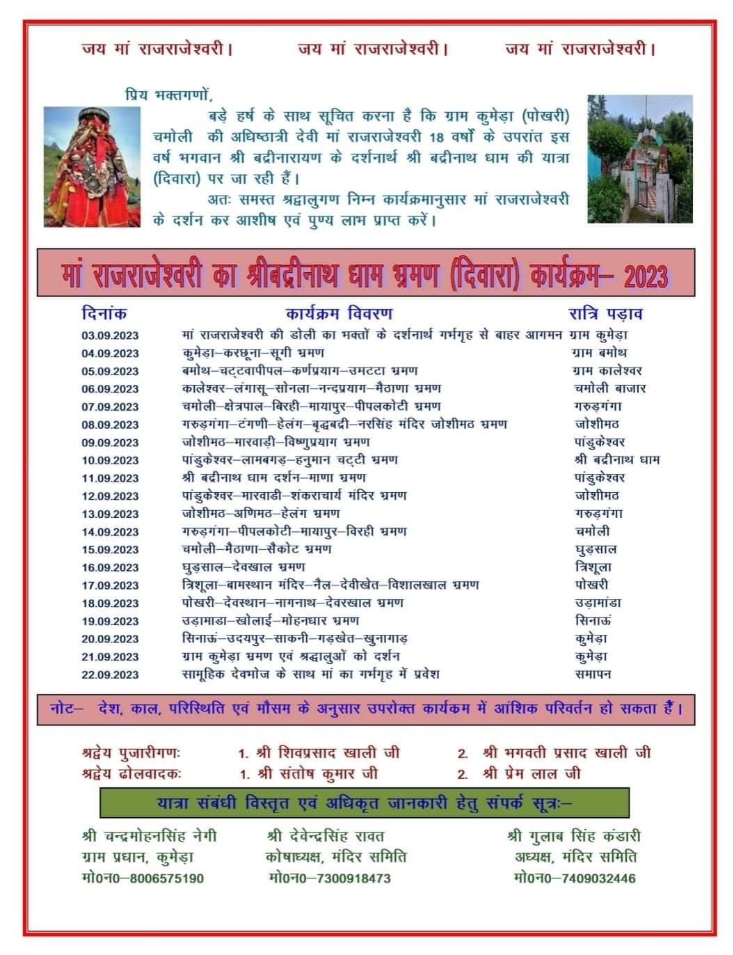 नागपुर पट्टी के कुमेड़ा गांव से भगवती राजराजेश्वरी इंद्रामती की डोली 4 सितंबर को अपने गृहक्षेत्र से प्रस्थान कर रात्रि विश्राम हेतु बमोथ पहुंचेगी। इसके बाद देवडोली 5 सितंबर को रात्रि प्रवास पर कालेश्वर, 6 सितंबर को रात्रि विश्राम चमोली बाजार, 7 सितंबर को गरुड़गंगा, 8 सितम्बर को जोशीमठ, 9 सितंबर को पांडुकेश्वर, 10 सितंबर को भगवान बद्रीनारायण में दर्शन पूजन एवं रात्रि प्रवास कर 11 सितम्बर को रात्रि विश्राम पांडुकेश्वर, 12 सितम्बर को जोशीमठ, 13 सितंबर को गरुड़ गंगा, 14 सितंबर चमोली बाजार रात्रि विश्राम करके 15 सितम्बर को घुड़साल में रात्रि विश्राम, 16 सितम्बर को त्रिशूला, 17 सितम्बर को पोखरी, 18 सितम्बर को उडामांडा, 19 सितम्बर को सिनाऊ में रात्रि विश्राम कर 20 सितम्बर को अपने गृहक्षेत्र कुमेड़ा में पहुंचेगी।मन्दिर समिति के अध्यक्ष गुलाब सिंह कण्डारी ने बताया कि 22 सितम्बर को अपने मूल स्थान में पहुंचने पर वहाँ स्थित मन्दिर में हवन पूर्णाहुति एवं भण्डारे के साथ देवरा यात्रा संपन्न होगी।