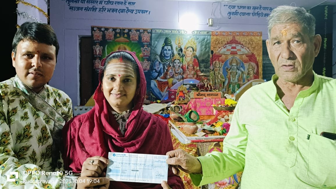 कथा के मुख्य यजमान पूर्व खण्ड शिक्षा अधिकारी श्रीमान रामप्रसाद बडोनी जी के द्वारा श्री बदरी नारायण संस्कृत विद्यालय रायकोली पिंडर घाटी थराली को भवन निर्माण हेतु 1 लाख 11 हजार रूपए की धनराशि दी गई। उन्होंने कहा पूज्या राधिका जोशी जी एवं नवीन जोशी जी के द्वारा सभ्यता एवं संस्कृति को संजोए रखने के लिए जो गुरुकुल का शुभारंभ किया गया है, उसमें हमें बढ़-चढ़कर भाग लेना चाहिए। और ऐसे धार्मिक कार्यों के लिए हमें तन मन धन से समर्पित होना चाहिए। और उन्होंने भक्तजनों से निवेदन किया कि आप सभी भी गुरुकुल में अवश्य सहयोग करें। और साथ ही साथ उन्होने आश्वासन दिया कि मैं आगे भी अपना पूर्ण रूप से गुरूकुल को सहयोग करूंगा।