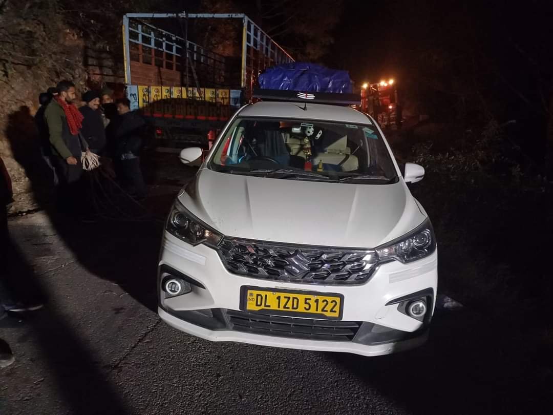 सड़क से आधा नीचे उतर गया है। इस सूचना पर पुलिस चौकी दुर्गाधार व कोतवाली रुद्रप्रयाग से तत्काल पुलिस बल मौके पर पहुंचा। मौके पर पुलिस टीम ने पाया कि वाहन संख्या DL1ZD5122 अर्टिका कार का अगला आधा हिस्सा सड़क से नीचे खाई की ओर उतरा हुआ है व कार में कुल 07 व्यक्ति सवार हैं। पुलिस टीम ने सभी वाहन सवार लोगों को सुरक्षित बाहर निकाला गया चूंकि कार लगातार नीचे खाई की ओर सरक रही थी, ऐसी दशा में पुलिस बल द्वारा सड़क पर गुजर रहे बड़े वाहन ट्रक को रुकवाकर नीचे की ओर खिसक रही कार को ट्रक से रस्से से बांध कर स्थिर किया गया। इस बीच पुलिस क्रेन को मंगवाकर कार को सड़क पर खींचकर सकुशल निकाल दिया गया है।   इस कार में सवार सभी 07 यात्री दिल्ली के निवासी हैं एवं सुरक्षित हैं। ये लोग आज सुबह दिल्ली से चलकर दुर्गाधार (चोपता) की तरफ जा रहे थे। इस वाहन में सवार सभी लोगों ने उनकी जरूरत के समय की गयी मदद व जीवन रक्षा के लिए पुलिस बल का आभार प्रकट किया गया है।