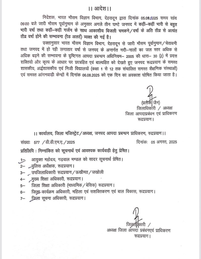 भारी बारिश का रेड अलर्ट: रुद्रप्रयाग जिले में 6 अगस्त को सभी स्कूल-कॉलेज और आंगनबाड़ी केंद्र बंद रहेंगे
