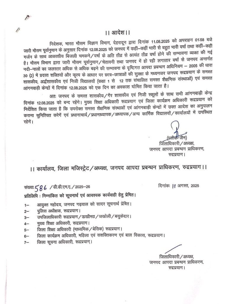 🛑 निदेशक, भारत मौसम विभाग देहरादून द्वारा जारी मौसम पूर्वानुमान एवं भारी बारिश होने की सम्भावना एवं चेतावनी के मध्येनजर दिनांक 12 अगस्त 2025 को जनपद रुद्रप्रयाग में संचालित समस्त शैक्षणिक संस्थान, कक्षा 1-12 तक (शासकीय, अशासकीय, निजी विद्यालय एवं समस्त आंगनवाड़ी केन्द्र) में छात्र-छात्राओ की सुरक्षा के दृष्टिगत स्कूल रहेंगे बन्द। जिलाधिकारी/अध्यक्ष, जिला आपदा प्रबन्धन एवं प्राधिकरण रुद्रप्रयाग ने जारी किए हैं आदेश।