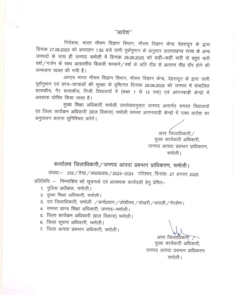 दस्तक पहाड न्यूज गोपेश्वर।। भारत मौसम विज्ञान विभाग, देहरादून द्वारा जारी पूर्वानुमान के अनुसार चमोली जिले में 28 अगस्त को भारी से बहुत भारी वर्षा/गरज के साथ बिजली चमकने तथा तेज आंधी-तूफान की संभावना जताई गई है। इसी को ध्यान में रखते हुए जिला प्रशासन ने सतर्कता बरतते हुए एहतियातन सभी सरकारी, गैर सरकारी एवं निजी विद्यालयों (कक्षा 1 से 12 तक) और आंगनबाड़ी केन्द्रों में एक दिन का अवकाश घोषित किया है।मुख्य शिक्षा अधिकारी चमोली को निर्देशित किया गया है कि वे सभी विद्यालयों में इस आदेश का अनुपालन सुनिश्चित करें। साथ ही जिला कार्यक्रम अधिकारी (बाल विकास) को सभी आंगनबाड़ी केन्द्रों को बंद रखने के निर्देश दिए गए हैं।अपर जिलाधिकारी, चमोली ने बताया कि यह निर्णय बच्चों की सुरक्षा और संभावित आपदा जोखिम को देखते हुए लिया गया है। उन्होंने जनपद वासियों से भी अपील की है कि मौसम विभाग के पूर्वानुमान को गंभीरता से लें और अनावश्यक रूप से नदियों, बरसाती नालों एवं भूस्खलन संभावित क्षेत्रों की ओर न जाएं।