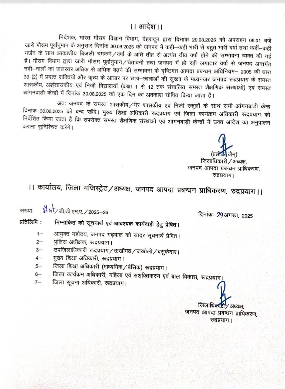 भारी से भारी बारिश का अलर्ट : रुद्रप्रयाग जिले में 30 अगस्त को सभी स्कूल-कॉलेज और आंगनबाड़ी केंद्र बंद रहेंगे