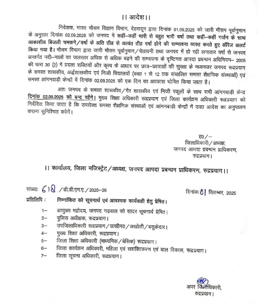 दस्तक पहाड न्यूज रुद्रप्रयाग। भारत मौसम विज्ञान विभाग, देहरादून द्वारा जारी पूर्वानुमान के अनुसार 2 सितम्बर को जनपद रुद्रप्रयाग में कहीं-कहीं भारी से बहुत भारी वर्षा एवं गर्जन के साथ आकाशीय बिजली चमकने की संभावना जताई गई है। मौसम विभाग ने इसको लेकर ऑरेंज अलर्ट जारी किया है।लगातार हो रही वर्षा से नदियों-नालों का जलस्तर बढ़ने और भूस्खलन की आशंका को देखते हुए जिला प्रशासन ने आपदा प्रबंधन अधिनियम 2005 की धारा 30(2) के तहत एहतियातन कदम उठाते हुए आदेश जारी किया है। जिलाधिकारी व आपदा प्रबंधन प्राधिकरण के अध्यक्ष ने निर्देश दिए हैं कि जिले के सभी सरकारी, गैर-सरकारी और निजी विद्यालय (कक्षा 1 से 12 तक), आंगनबाड़ी केंद्र तथा समस्त शिक्षण संस्थान 2 सितम्बर 2025 को एक दिन के लिए बंद रहेंगे।जिलाधिकारी ने मुख्य शिक्षा अधिकारी और जिला कार्यक्रम अधिकारी को आदेश का अनुपालन सुनिश्चित करने के निर्देश दिए हैं।