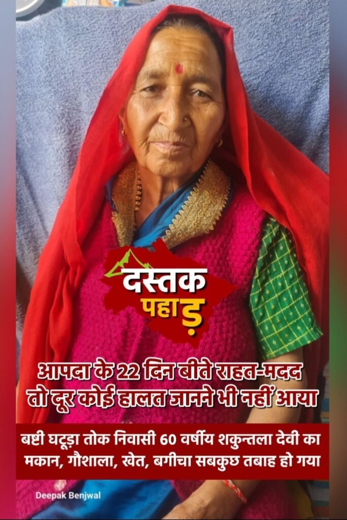 दीपक बेंजवाल  / दस्तक पहाड न्यूज  उत्तराखंड के पहाड़ों पर बरसात और आपदाएँ अब लोगों के जीवन का सबसे बड़ा डर बन चुकी हैं। रुद्रप्रयाग जनपद के अगस्त्यमुनि विकासखंड के बस्ती गांव की 60 वर्षीय शकुंतला देवी इसका जीता-जागता उदाहरण हैं। पाँच साल पहले मलबे में पति की जान गंवाने वाली यह पीड़िता इस बार आई जलप्रलय में अपनी बची-खुची दुनिया भी खो बैठीं।