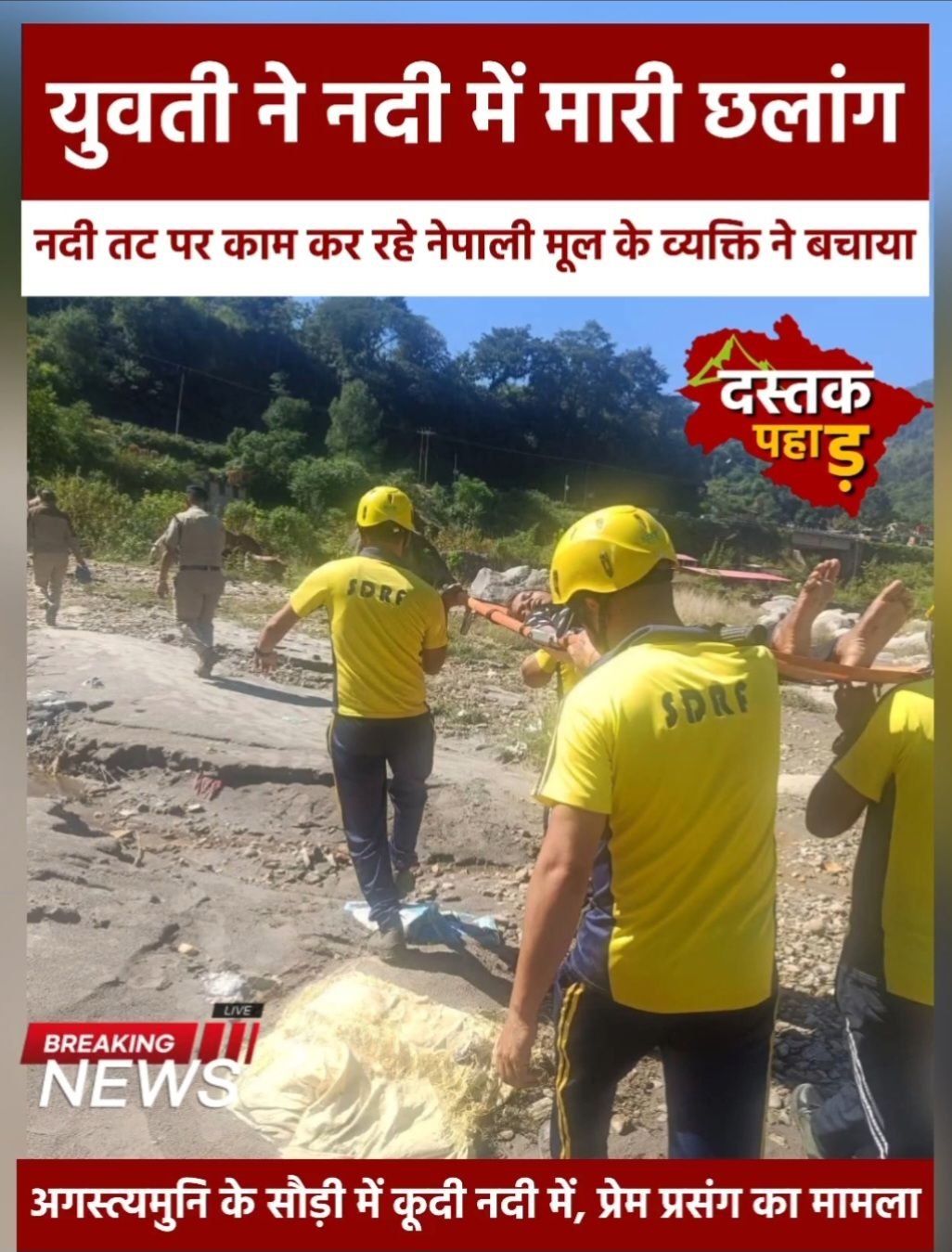 दस्तक पहाड न्यूज अगस्त्यमुनि। केदारघाटी क्षेत्र के सौड़ी में शनिवार सुबह एक दिल दहला देने वाली घटना सामने आई, जहां प्रेम प्रसंग में आहत एक युवती ने मंदाकिनी नदी में छलांग लगाकर आत्महत्या करने का प्रयास किया। घटना की सूचना मिलते ही पुलिस एसडीआरएफ टीम और स्थानीय लोगों की तत्परता से युवती की जान बच गई। सूत्रों के अनुसार युवती का प्रेम संबंध चल रहा था, जो सोशल मीडिया के माध्यम से शुरू हुआ था। बताया जा रहा है कि युवक ने युवती से प्रेम का दिखावा कर न केवल