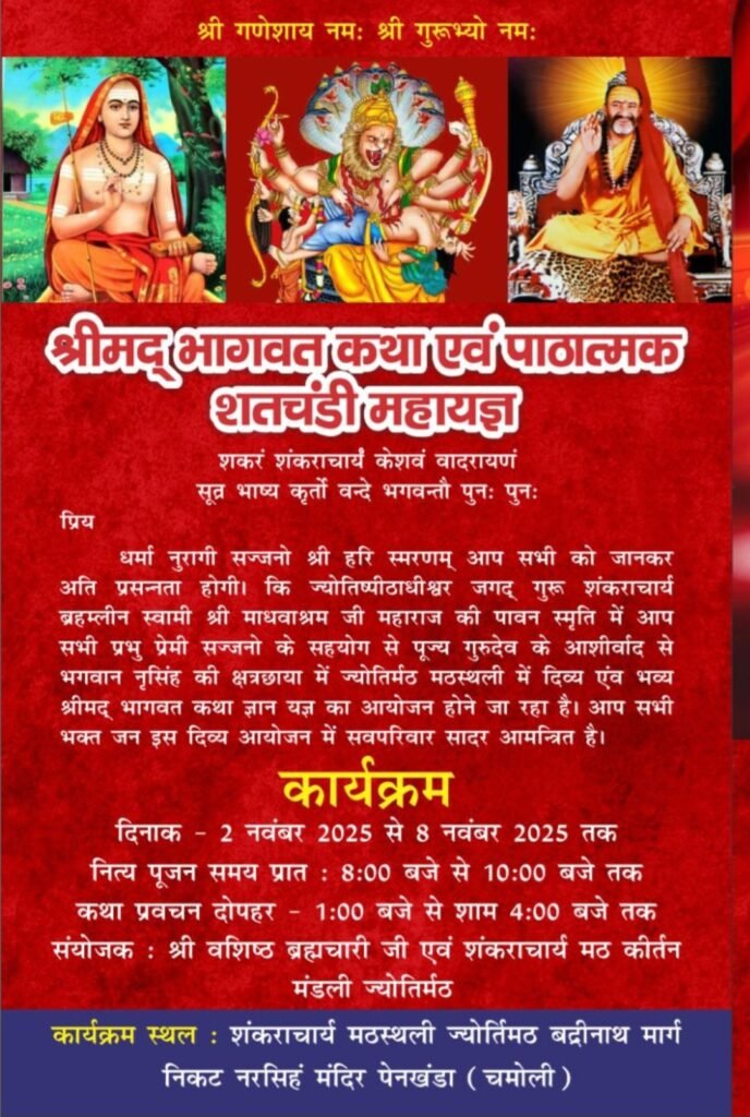 ज्योतिर्मठ बद्रीनाथ मार्ग स्थित शंकराचार्य मठस्थली निकट नरसिंह मंदिर में ब्रह्मलीन ज्योतिषपीठाधीश्वर जगद्गुरु शंकराचार्य अनन्त श्री विभूषित स्वामी माधवाश्रम जी महाराज की पावन पुण्य स्मृति में श्रीमद्भागवत कथा एवं शतचंडी महायज्ञ का आयोजन 2 नवंबर से 8 नवंबर 2025 तक आयोजित होगा, जिसके अंतर्गत प्रतिदिन प्रातः 8 बजे से 10 बजे तक नित्य पूजन तथा दोपहर 1 बजे से 4 बजे तक कथा प्रवचन होंगे। आयोजन श्री वशिष्ठ ब्रह्मचारी जी एवं शंकराचार्य मठ कीर्तन मंडली ज्योतिर्मठ के संयोजन में किया जा रहा है। इस अवसर पर कथा व्यास परम श्रद्धेय पं नीरज शास्त्री जी प्रवचन देंगे। कार्यक्रम में श्री सिद्ध शिव मंदिर दरिया चंडीगढ़ (कीर्तन मंडली), उत्तराखंड कीर्तन मंडली दरिया चंडीगढ़, अन्नु महादेव कांवड़ सेवा दल चंडीगढ़, श्री साईं मंदिर सेक्टर 29 चंडीगढ़, श्री लक्ष्मी नारायण मंदिर बेलबाबा (जगाधरी) तथा श्री गौरी शंकर मंदिर जडुआ गेट (जगाधरी) जैसी अनेक धार्मिक संस्थाएं सहयोग कर रही हैं।