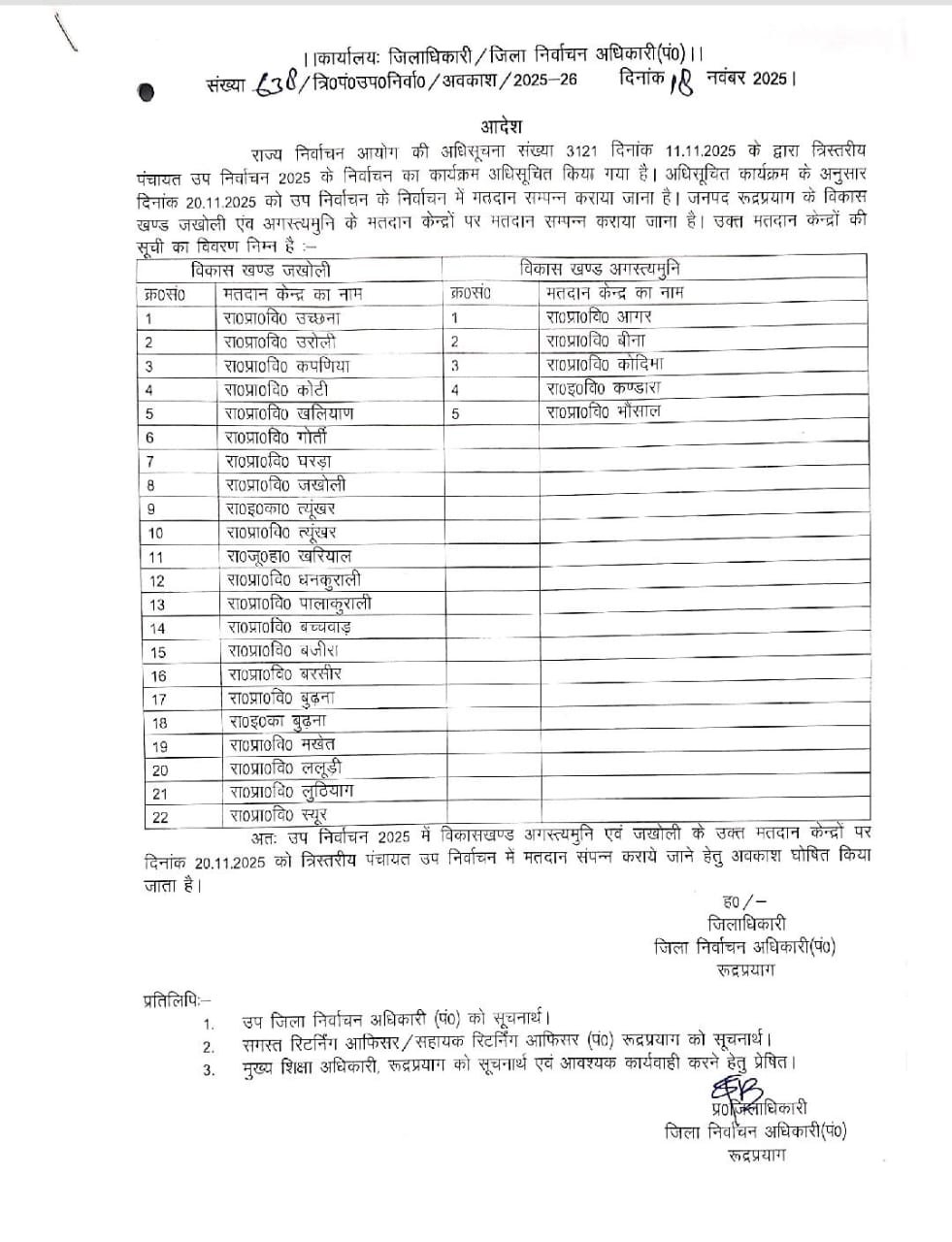 दस्तक पहाड न्यूज रुद्रप्रयाग।। जनपद के अंतर्गत ऐसे समस्त विद्यालयों में 20 नवंबर को अवकाश रहेगा जिनको उप निर्वाचन हेतु मतदान केंद्र बनाया गया है। जिला निर्वाचन अधिकारी के आदेश के बाद विकासखंड अगस्त्यमुनि में 05 जबकि जखोली के कुल 22 विद्यालयों में मतदान प्रक्रिया संपन्न कराए जाने हेतु अवकाश घोषित किया गया है। राज्य निर्वाचन आयोग की अधिसूचना के अनुसार त्रिस्तरीय उप निर्वाचन कार्यक्रम अधिसूचित किया गया है। उप निर्वाचन मतदान के दृष्टिगत जिलाधिकारी के निर्देश के बाद विकास खंड