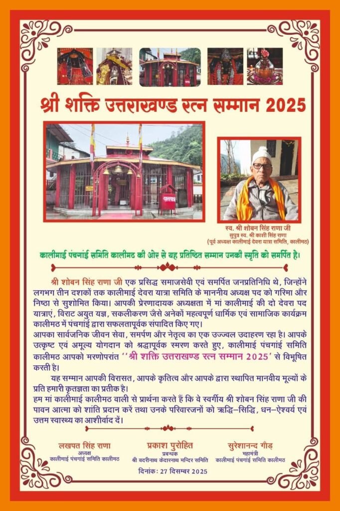कालीमाई पंचगांई समिति, कालीमठ द्वारा प्रथम “श्री शक्ति उत्तराखण्ड रत्न 2025” से सम्मानित हुए स्वर्गीय शोबन सिंह राणा, सेवा-संस्कार और नेतृत्व की अमिट मिसाल