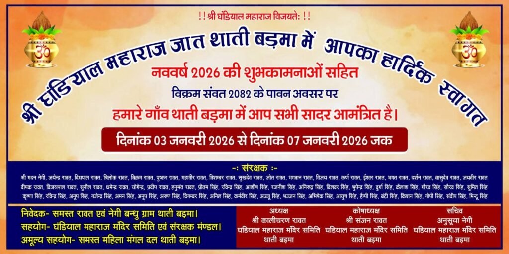 घंडियाल महाराज मन्दिर समिति, थाती-बड़मा के अध्यक्ष कालीचरण रावत ने बताया कि श्री घंडियाल महाराज बड़ी जात क्षेत्र की प्राचीन और गौरवशाली परंपरा है, जो आस्था के साथ-साथ सामाजिक एकता का भी प्रतीक है। उन्होंने कहा कि आयोजन को भव्य, दिव्य एवं सुव्यवस्थित बनाने के लिए समिति द्वारा सभी आवश्यक तैयारियाँ पूर्ण कर ली गई हैं। समिति की सचिव अनुसूया नेगी ने जानकारी दी कि कार्यक्रम की रूपरेखा के अनुसार सभी धार्मिक अनुष्ठान पारंपरिक विधि-विधान से सम्पन्न कराए जाएंगे तथा श्रद्धालुओं की सुविधा और सुरक्षा का विशेष ध्यान रखा जाएगा। वहीं कोषाध्यक्ष संजन रावत ने बताया कि आयोजन हेतु आर्थिक प्रबंधन, दान-सहयोग एवं भण्डारे की व्यवस्थाओं को सुचारु रूप से सुनिश्चित किया गया है, जिससे श्रद्धालुओं को किसी प्रकार की असुविधा न हो। मन्दिर समिति ने समस्त क्षेत्रवासियों एवं श्रद्धालुओं से अपील की है कि वे अधिक से अधिक संख्या में पहुंचकर श्री घंडियाल महाराज के दर्शन कर पुण्य लाभ प्राप्त करें तथा आयोजन को सफल बनाने में सहयोग करें।