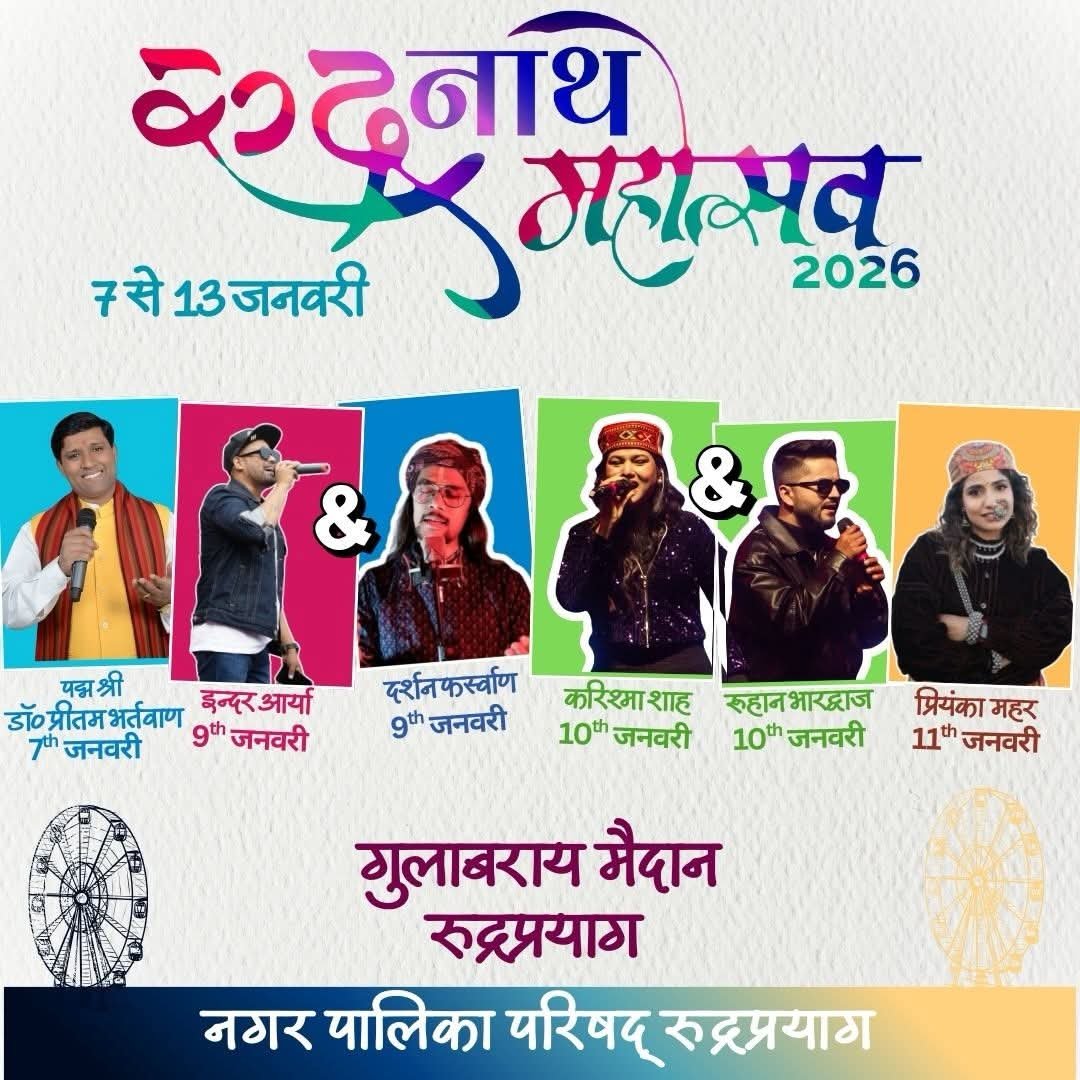 जनपद मुख्यालय स्थित गुलाब राय मैदान में नगर पालिका रुद्रप्रयाग के तत्वावधान में 7 जनवरी से 13 जनवरी तक आयोजित होने वाले रुद्रनाथ महोत्सव एवं शीतकालीन यात्रा उत्सव 2026 का भव्य आगाज 7 जनवरी को किया जाएगा। महोत्सव का शुभारंभ ढोल-दमों की गूंज, पारंपरिक लोक संस्कृति और ऊंट की शाही सवारी के साथ किया जाएगा, जो इस आयोजन का मुख्य आकर्षण रहेगा।