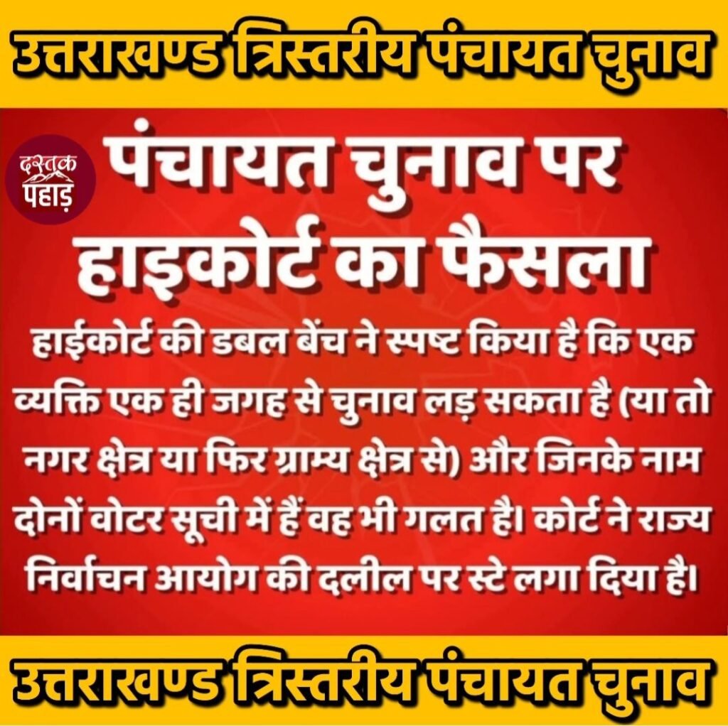 दस्तक पहाड़ न्यूज नैनीताल।। उत्तराखण्ड में पंचायती चुनावों से ठीक पहले उच्च न्यायालय ने चुनाव याचिका को सुनते हुए एक...