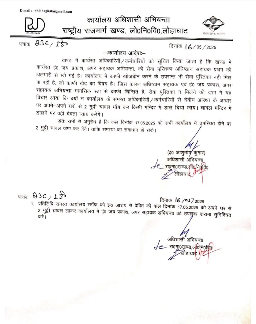 दस्तक पहाड़ न्यूज, अगस्त्यमुनि।। उत्तराखंड लोक निर्माण विभाग (PWD) इन दिनों एक अजीबोगरीब आदेश को लेकर सुर्खियों में है। लोहाघाट...
