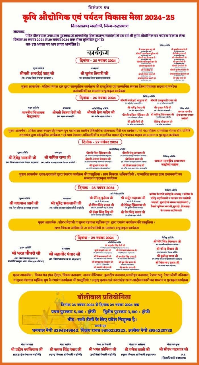 दस्तक पहाड न्यूज / जखोली। विकासखंड जखोली मुख्यालय में पांच दिवसीय कृषि, पर्यटन एवं औद्योगिक विकास मेला 25 नवंबर से...