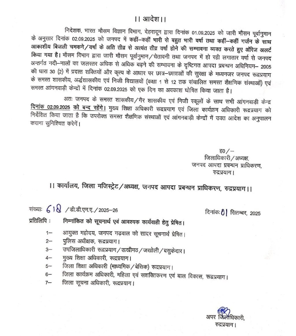 दस्तक पहाड न्यूज रुद्रप्रयाग। भारत मौसम विज्ञान विभाग, देहरादून द्वारा जारी पूर्वानुमान के अनुसार 2 सितम्बर को जनपद रुद्रप्रयाग में कहीं-कहीं...