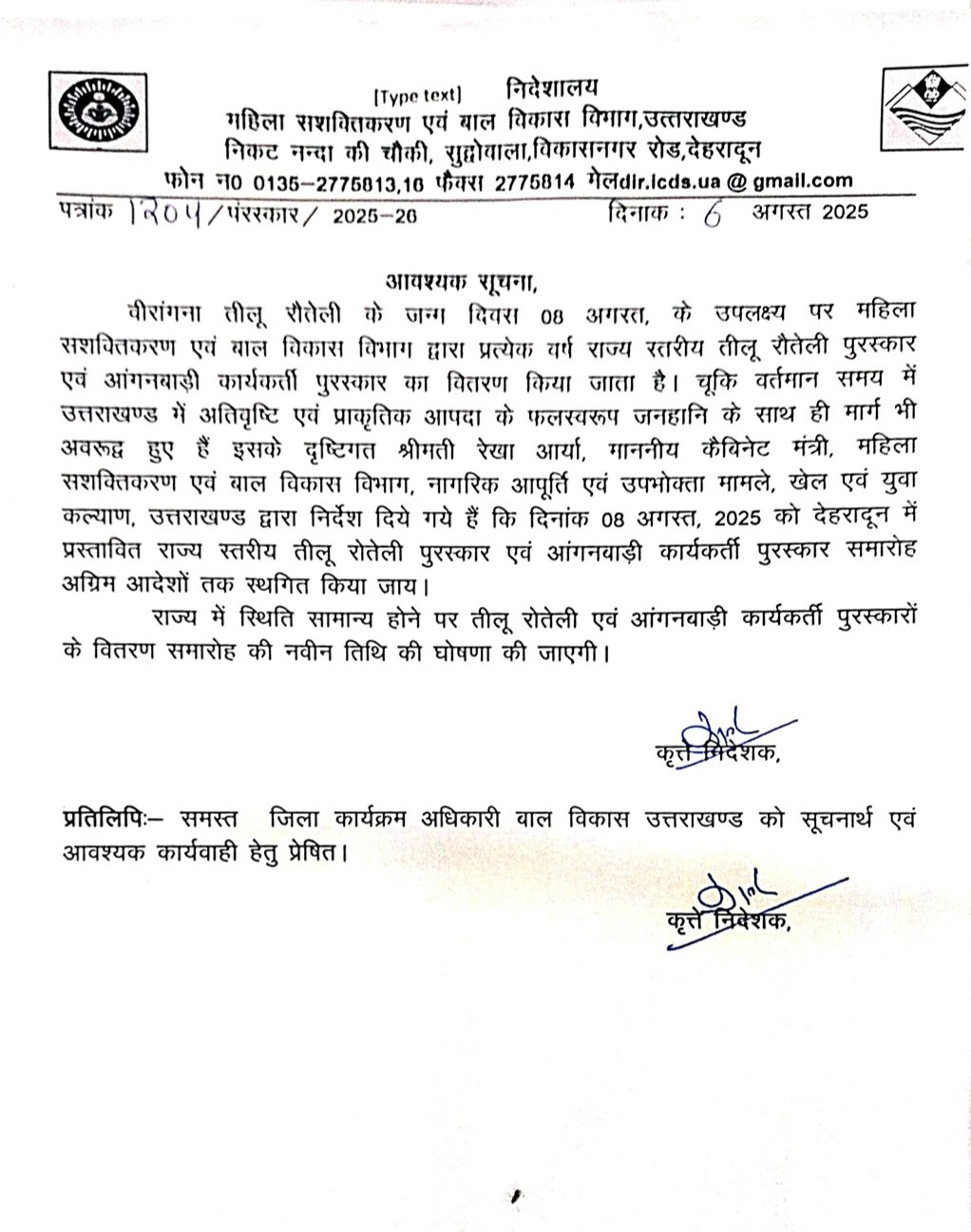 दस्तक पहाड न्यूज, देहरादून।। महिला सशक्तिकरण एवं बाल विकास विभाग, उत्तराखण्ड द्वारा हर वर्ष आयोजित होने वाला राज्य स्तरीय तीलू...