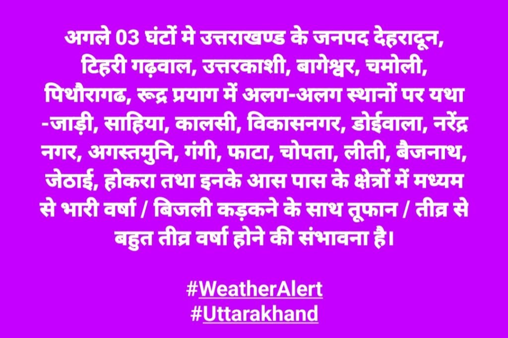 दस्तक पहाड न्यूज अगस्त्यमुनि।। अगले 03 घंटों मे उत्तराखण्ड के जनपद देहरादून, टिहरी गढ़वाल, उत्तरकाशी, बागेश्वर, चमोली, पिथौरागढ, रूद्रप्रयाग में...